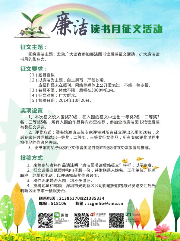 4、投稿地址和邮箱:深圳市光明新区公明街道振明路与兴发路交汇处 光明新区图书馆一楼服务台,联系电话:21385370或21385334,邮编:518106;邮箱:szgmlib@sina.cn。