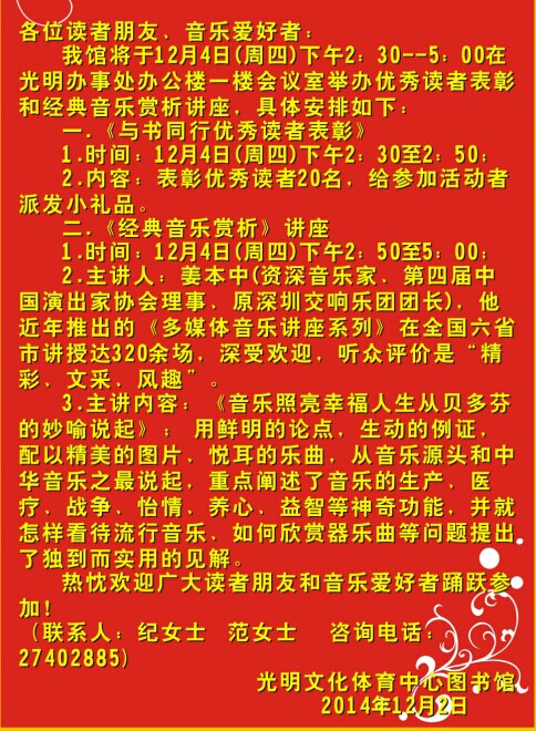 光明文化体育中心图书馆将于12月4日(周四)下午2:30--5:00在光明办事处办公楼一楼会议室举办优秀读者表彰和经典音乐赏析讲座,具体安排如下: