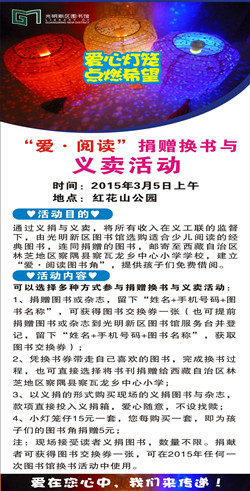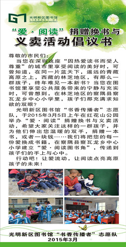光明新区图书馆“书香传播者”志愿队,于2015年3月5日上午9点30分在红花山公园举办“爱•阅读”捐赠换书与义卖活动,希望大家关注这样的一群孩子,并为他们伸出您温暖的双手,捐赠一本书,或者一块钱……我们将把您的每一份爱换成书籍,在察隅县察瓦龙乡中心小学建立“爱•阅读图书角”,传递到孩子们的手上与心中。