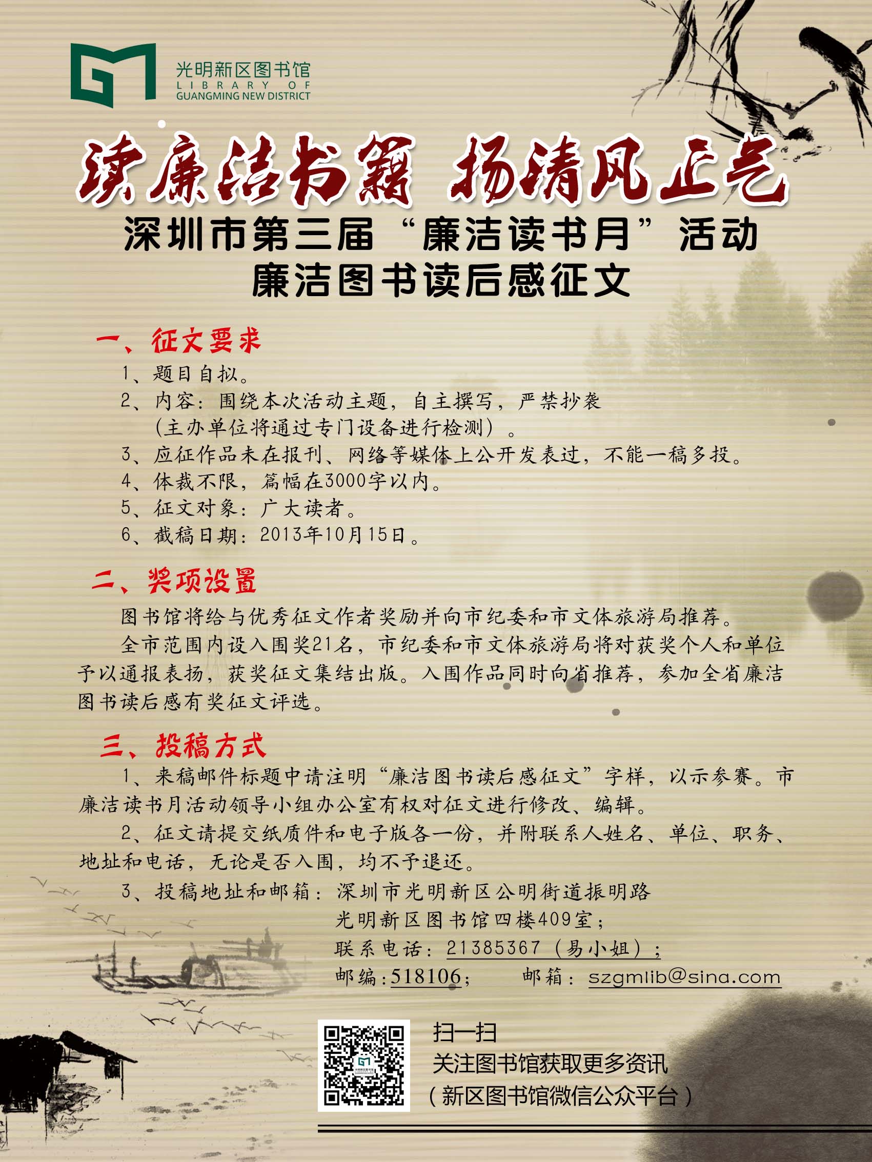 3、投稿地址和邮箱:深圳市光明新区公明街道振明路光明新区图书馆四楼409办公室,联系电话:21385367,邮编518106,邮箱:szgmlib@sina.com