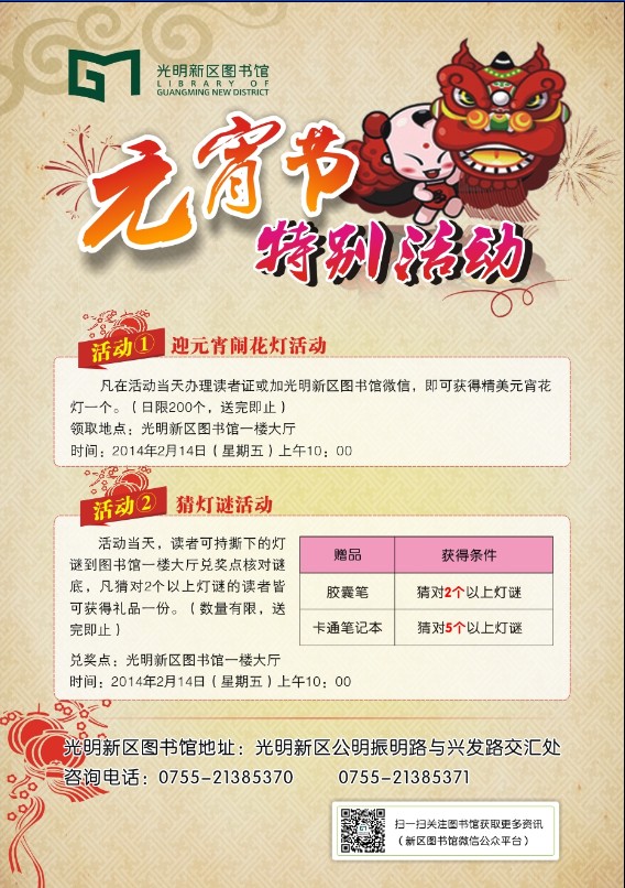 凡在活动当天办理读者证或加光明新区图书馆微信,即可获得精美元宵花灯一个。(日限200个,送完即止)
