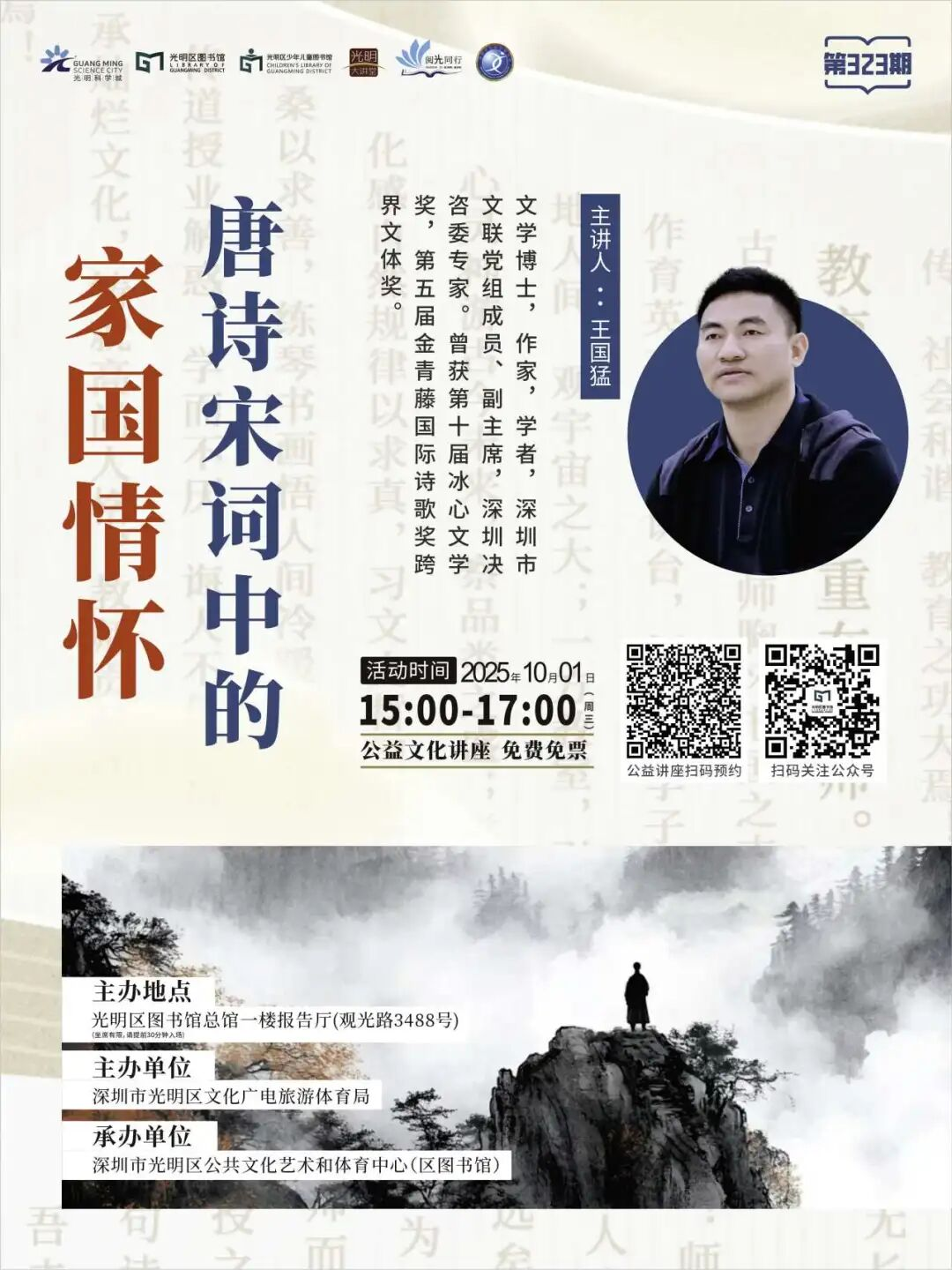 10月1日(周三),正值国庆节当天,光明大讲堂特邀文学博士、知名学者王国猛带来《唐诗宋词中的家国情怀》主题讲座。他将围绕“建功立业、报效祖国、披露现实、感时忧世”等内容,串联起唐诗与宋词中的家国热忱,剖析经典诗作背后的壮阔历史,解读诗人创作时的人生境遇与理想追求,展开一场关于家国情怀的千年回望。
