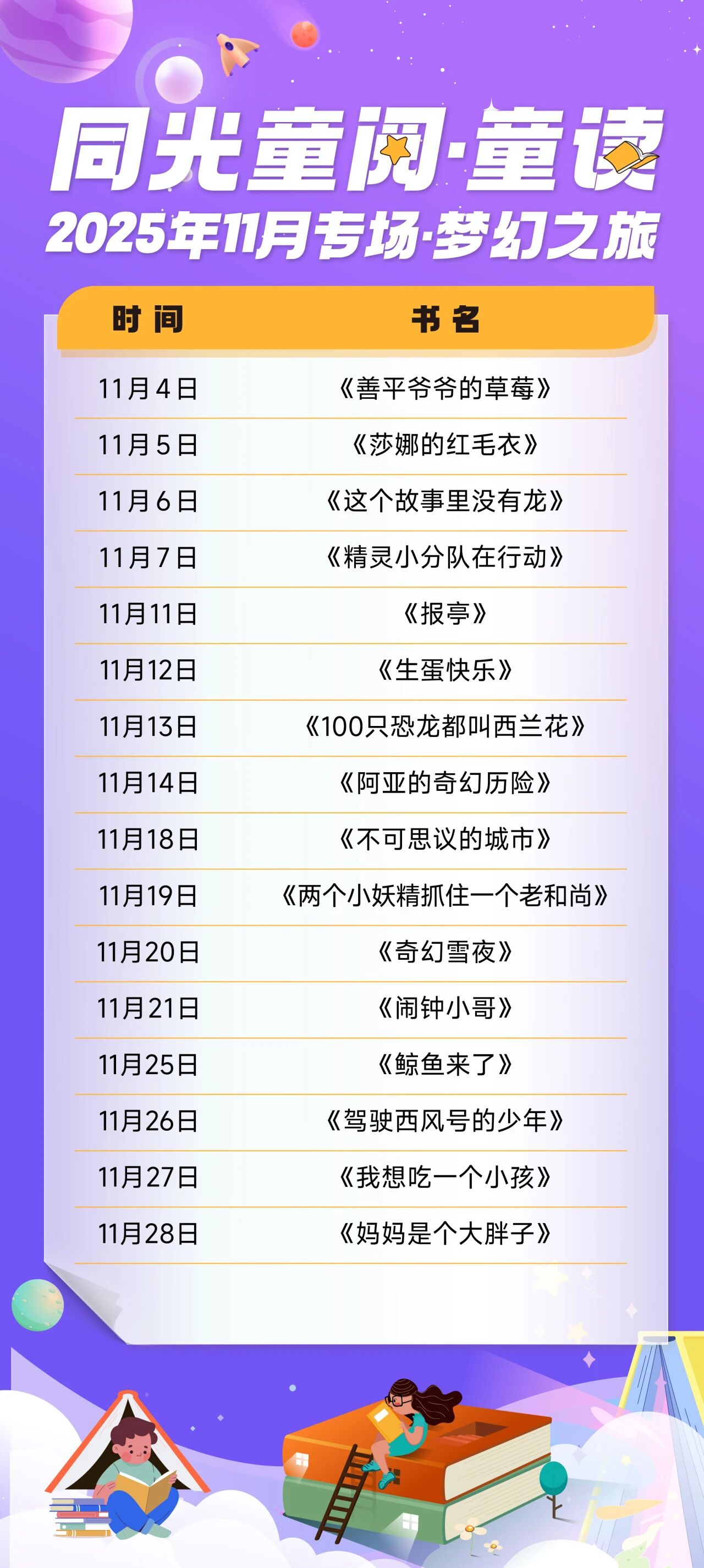 十一月是一个承上启下的月份,它既代表着秋的结束,也标志着冬的开始,是圆满,亦是新生。光明区少年儿童图书馆将在11月份举办2025年“同光童阅・童读”之“梦幻之旅”主题活动,和各位小读者漫步在书页云端,找到属于自己的梦幻国度。本月活动将结合图书馆馆藏图书资源,聚焦青少年儿童群体特征和阅读爱好习惯,结合童年幻想、美好童真、成长收获等内容,精选16本优秀图画书,与孩子们在知识的海洋中共赴“梦幻之旅”,通过主题活动让小读者收获敢于想象的勇气、拥抱未知的热情,还有那片永远璀璨的内心星空。