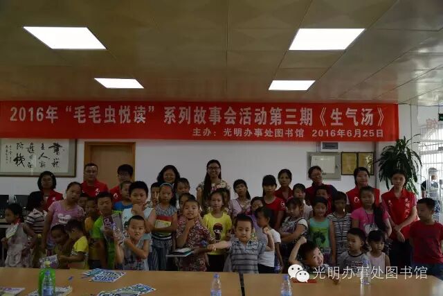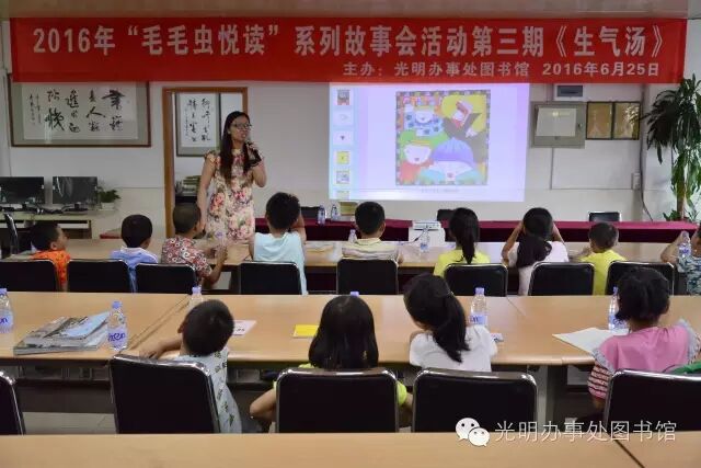 发布时间:2016-07-14 阅读次数:62346 月25日下午光明办事处图书馆迎来了毛毛虫悦读第三期《生气汤》,此绘本描绘的是小男孩霍斯今天过得很不高兴。他带着一肚子怒气回家。但是,他妈妈却说要煮汤。当水滚开时,妈妈对着锅子大叫,她要霍斯也照样做。他们还一起对着锅子龇牙咧嘴、吐舌头、大声敲打锅子。最后,小男孩笑了,心里也快活多了。