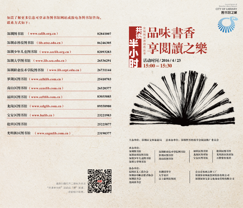 “共读半小时”活动是由深圳市文体旅游局主办,深圳图书情报学会阅读推广委员会总承办,全市各公共图书馆、高校图书馆联合共同发起的全城联动阅读项目。旨在唤醒阅读意识,推广阅读理念,培养阅读习惯。本次活动围绕“阅读在我家”年度主题,提倡家庭阅读,亲子阅读。您可以参加全市公共图书馆在23个公共空间的阅读show,也可以于同一时间在任何地点参与我们的“共读”活动。无论您身在何方,我们需要您支持阅读的态度,请到我们的网页为共读活动点赞。全城共读,把我们热爱阅读的态度高调亮相,让阅读无处不在!